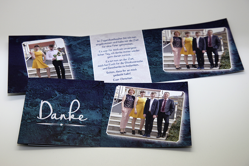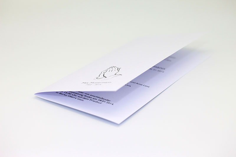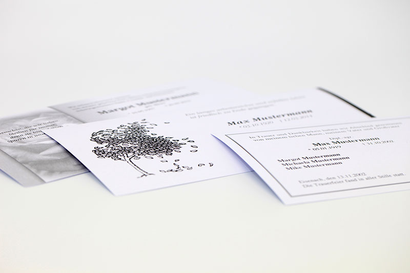 Wählen Sie aus unserem umfangreichen Musterkatalog eine Vorlage aus oder lassen Sie sich ein Design nach Ihren Wünschen gestalten. Wir integrieren auf Wunsch private Fotos oder anderes Bildmaterial, z. B. Zeitungsartikel, Geburtsurkunde etc. Neben den klassischen Formaten DIN A6 und DIN lang sind auch Sonderformate möglich. Wir beraten Sie dazu gern.