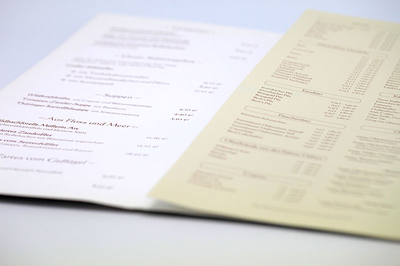 Waren die Speisekarten früher noch grafische Kunstwerke, sind die heutigen Speisekarten leider oftmals nur noch eine Aufzählung der angebotenen Speisen und Getränke. Präsentieren Sie Ihr Restaurant oder Café von seiner besten Seite mit einer individuell gestalteten Speisekarte.